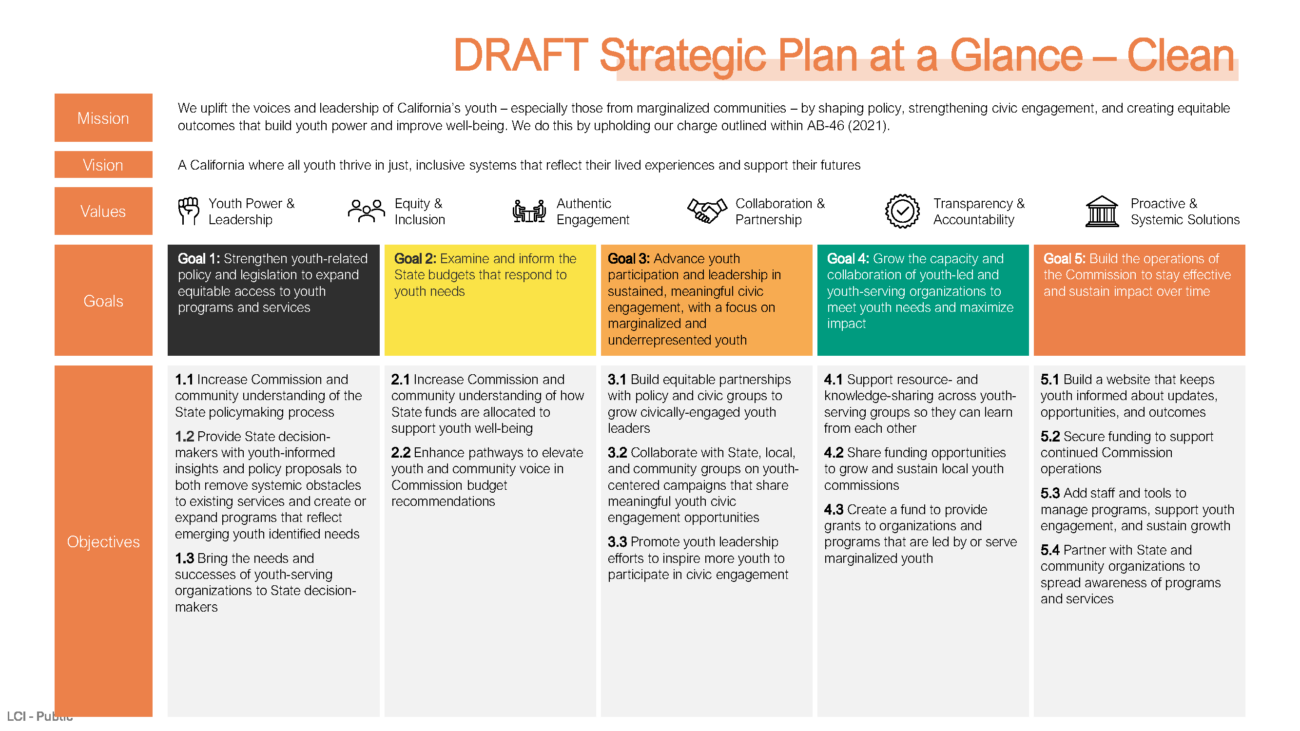 GOAL: Build the operations of the Commission to stay effective and sustain impact over time. Objectives: 5.1 Build a website that keeps youth informed about updates, opportunities, and outcomes. 5.2 Secure funding to support continued Commission operations. 5.3 Add staff and tools to manage programs, support youth engagement, and sustain growth. 5.4 Partner with State and community organizations to spread awareness of programs and services.GOAL 5. Operational Infrastructure
